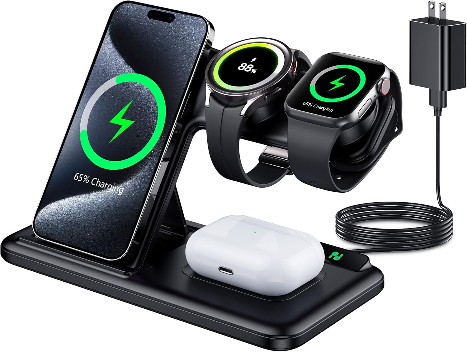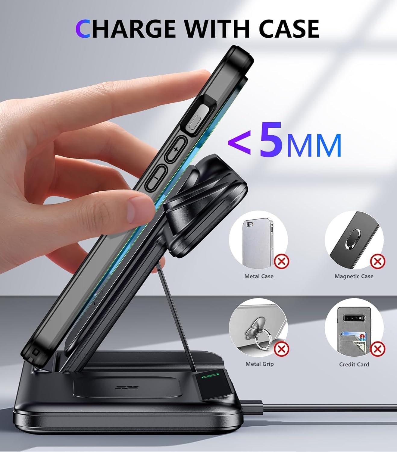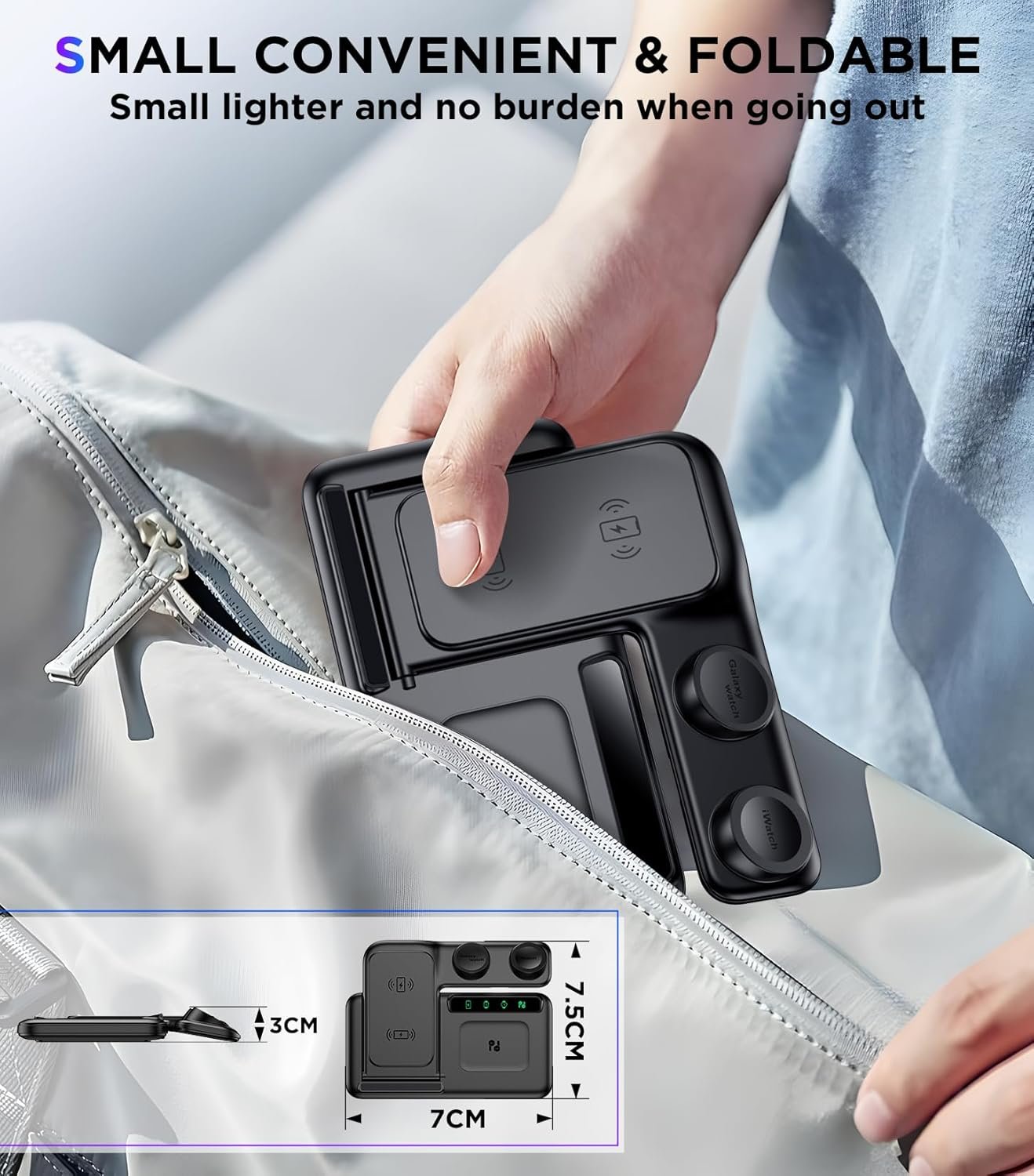 【Portable & Foldable Travel Charger Stand】Designed to be portable and foldable, this charging station for iPhone is lightweight and can easily fit in your bag or suitcase.Whether you are at home, in the office, or traveling, this 4-in-1 charger allows you to charge multiple devices simultaneously.It also doubles as a versatile cell phone stand with adjustable angles.You can use it as a charging pad by laying your phone flat on it.