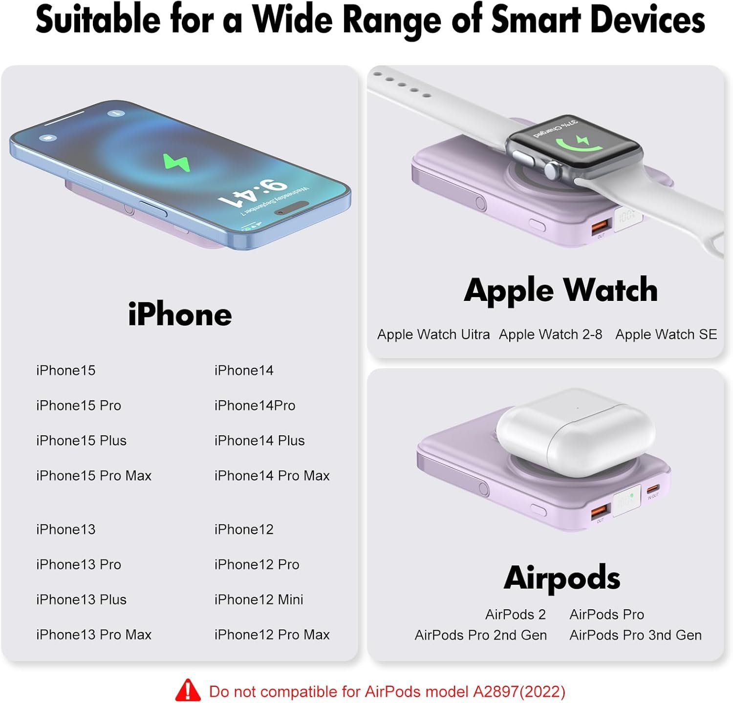 【Suitable for a Wide Range of Smart Devices】This Mag-safe battery pack is perfectly designed for iPhone 16, iPhone 16 Plus, iPhone 16 Pro, iPhone 16 Pro Max, iPhone 15, iPhone 15 Plus, iPhone 15 Pro, iPhone 15 Pro Max, iPhone 14, iPhone 14 Plus, iPhone 14 Pro, iPhone 14 Pro Max, iPhone 13, iPhone 13 mini, iPhone 13 Pro, iPhone 13 Pro Max, iPhone 12, iPhone 12 mini, iPhone 12 Pro, and iPhone 12 Pro Max,Apple Watch series (Ultra/8/7/6/SE/5/4/3/2/1) ,Airpods 2/ Airpods 3rd Gen/Airpods Pro/Airpods Pro 2nd Gen ONLY. Note: We recommend charging with a Mag-Safe phone case or without cases to get enough suction for better experience.