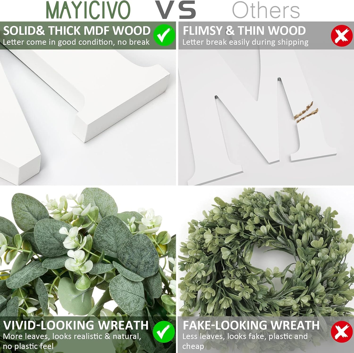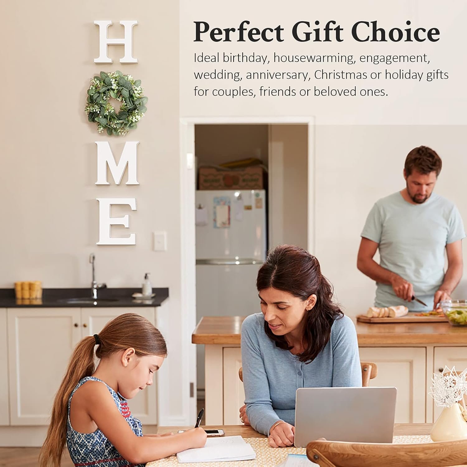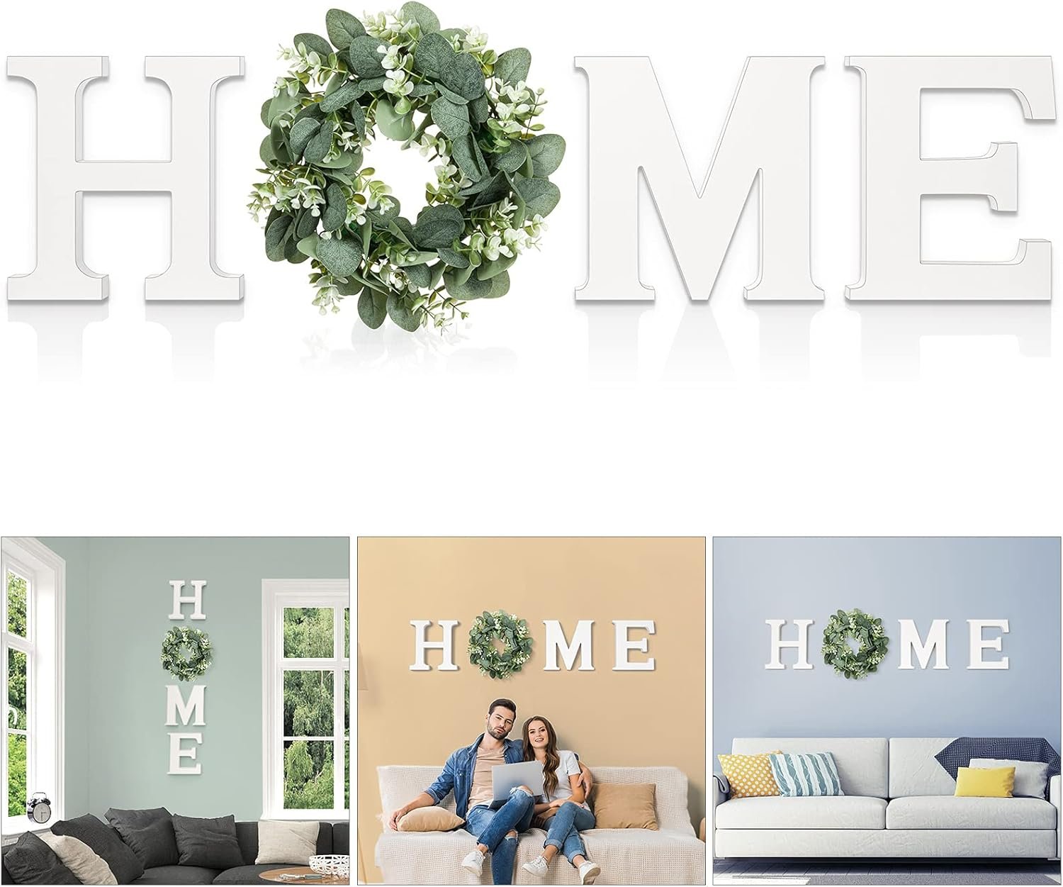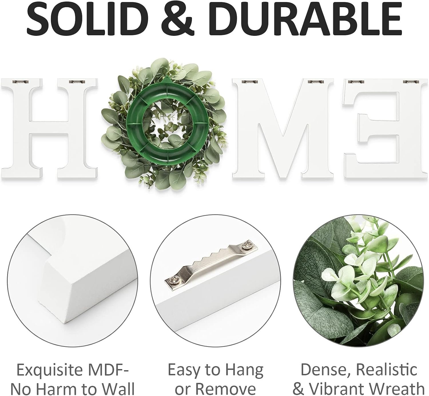 DURABLE & RELIABLE QUALITY: The home sign with wreath comes with wood letters “H”, “M”, “E” and artificial eucalyptus greenery wreath for “O”. The wood home letters for wall decor is made of high-quality, durable MDF wood, sturdy, thick, no breaks and no fading. The vivid-looking wreath is made of high-quality cloth and plastic, silk , non-toxic, looks natural and never wither and fall. The whole set enhance warmth and charming feeling to your home.