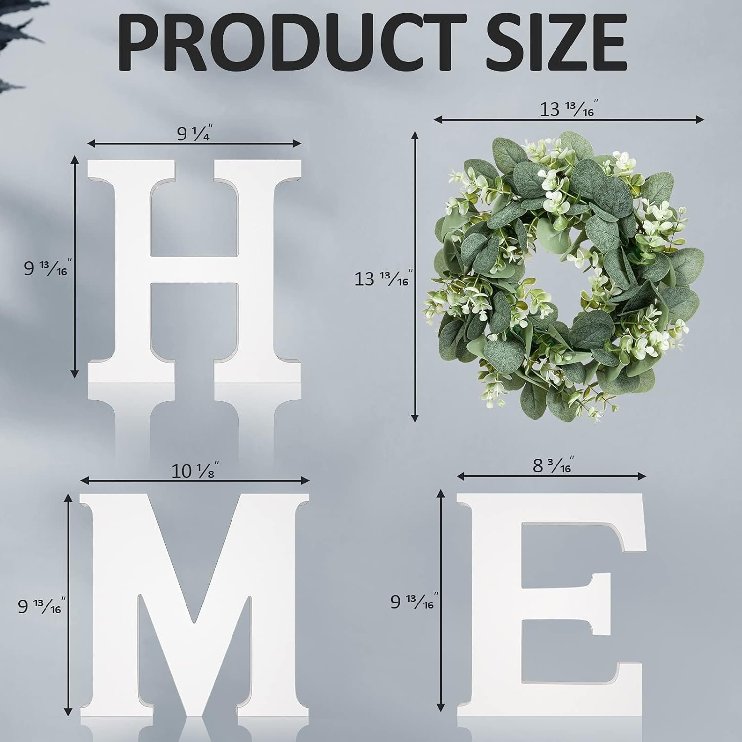 EASY MOUNTING & PERFECT SIZE:The wall hanging home sign is easy to hang with two sawtooth hanger on the back of each letter and hanging hole of the the wreath. The letters can be showcased horizontally, vertically, tabletop display or any way you’d like. Size: Letter “H”: 9.8”H x 9.3”W x 0.8”THK; Wreath “O”: 13.8” Diameter; Letter “M”: 9.8”H x 10.2”W x 0.8”THK; Letter”E”: 9.8”H x 8.2”W x 0.8”THK. Totally a gorgeous addition to any room in your house!