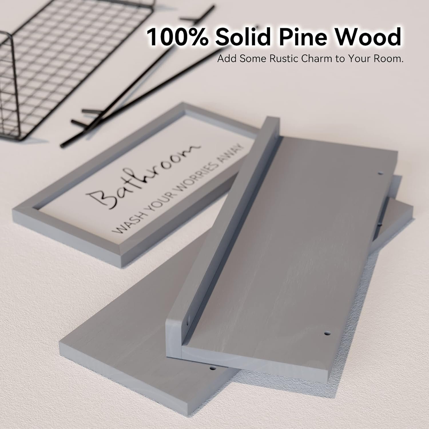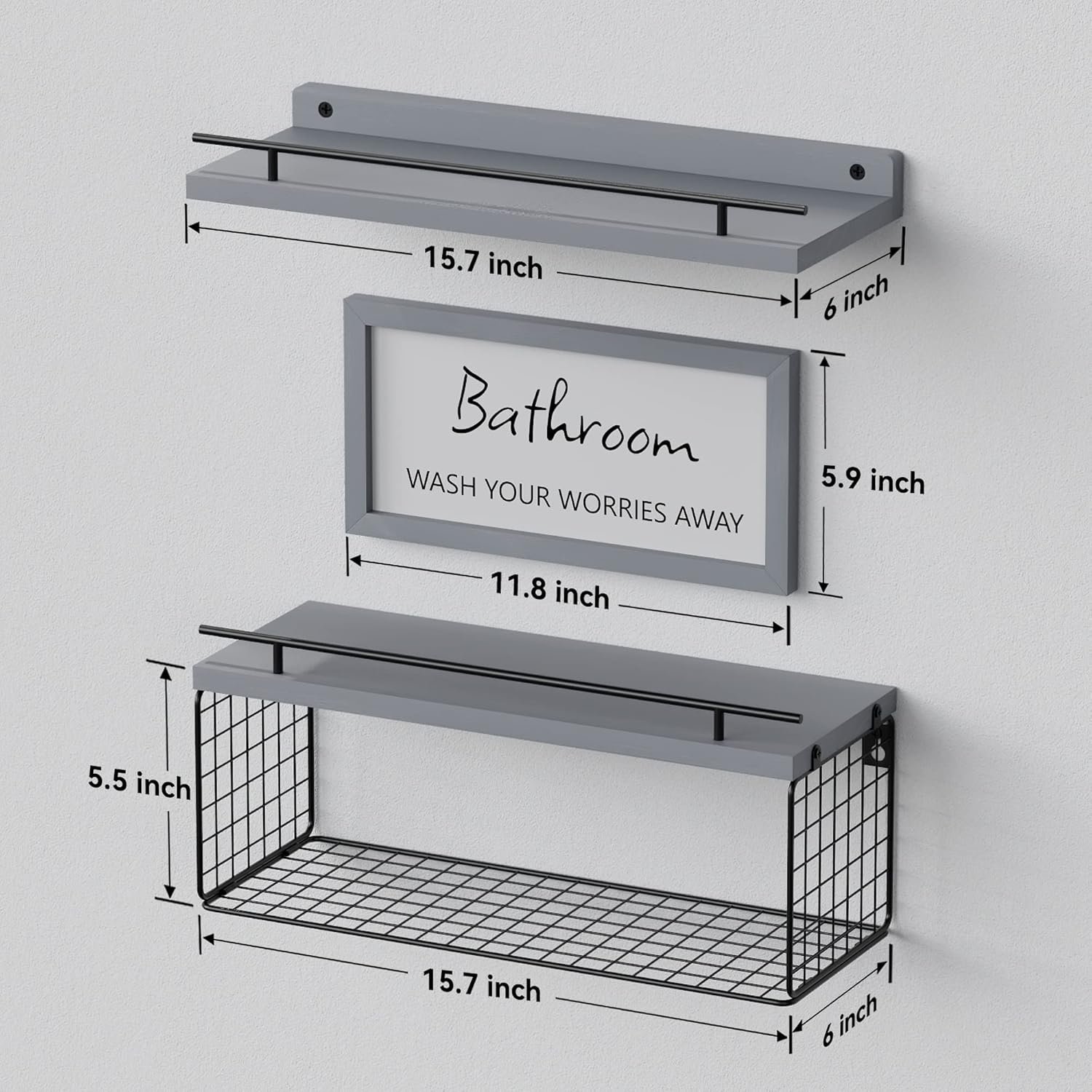 Bathroom Wall Décor 3 Set – Farmhouse Style Combination – WOPTUES Farmhouse style bathroom wall décor set included: wall bathroom sign & floating wall shelves with guardrail & floating wall shelves with basket . Storage your bathroom, but not just storage. Let’s make your bathroom CUTE & RUSTIC. Add a funny touch to your half bath!
