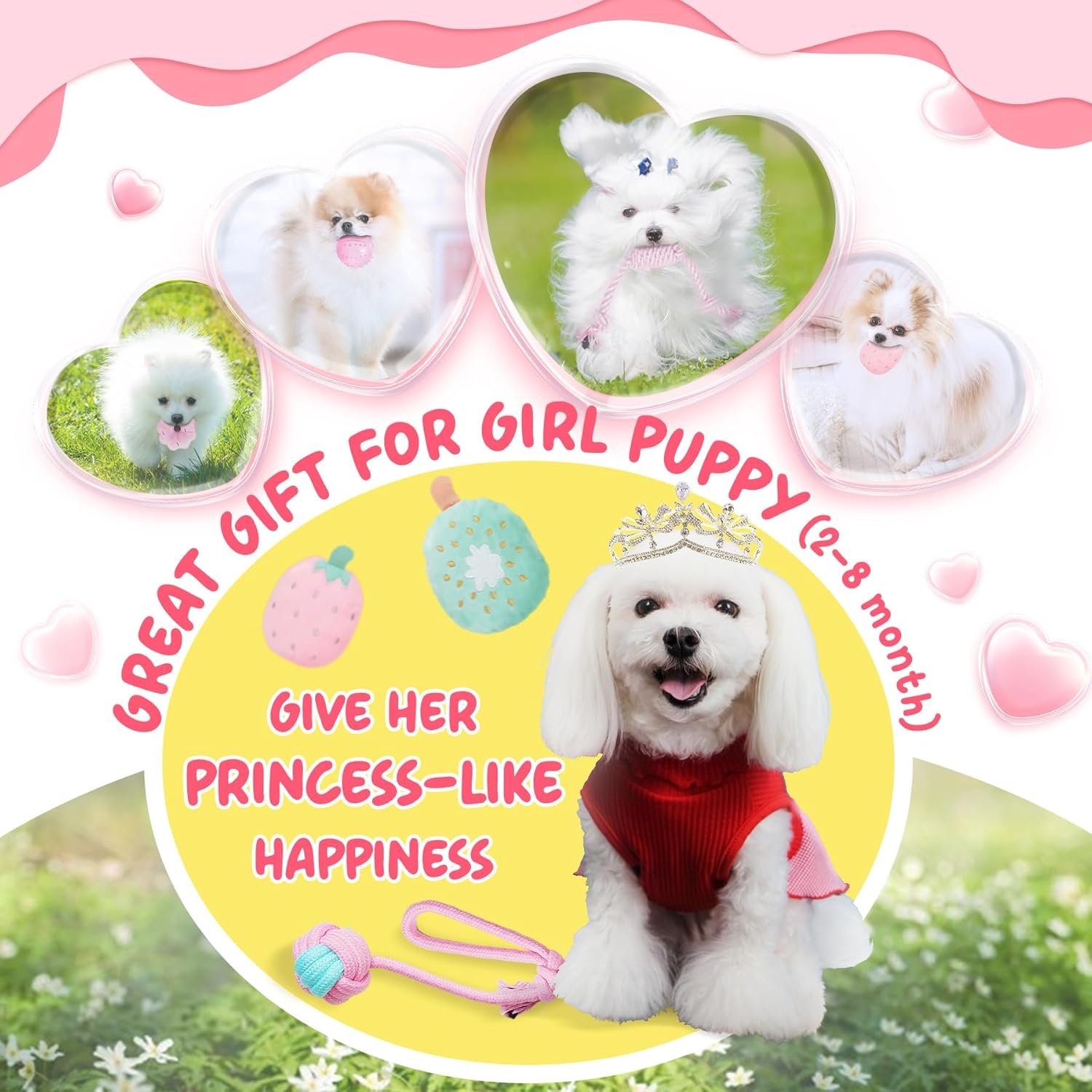 Pink Dog Toys for Female Puppy: Great for female dogs (under 25 Lbs), including 8 rope toys, 5 squeaky plush toys, 4 rubber chew toys, 1 treat ball, 4 dog bag rolls and 1 dispenser. Cute pink design creates princess-like happiness for your puppy