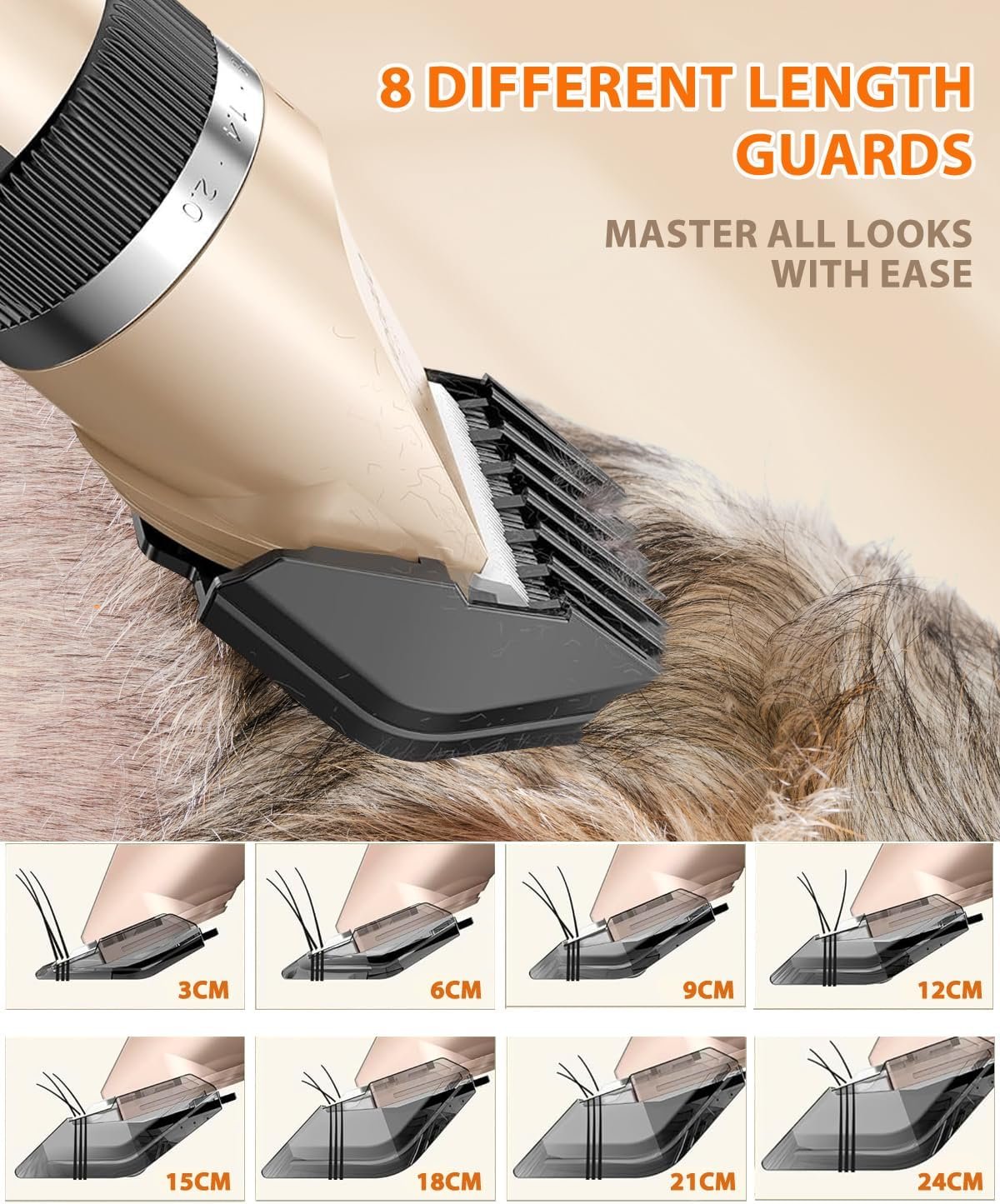 All-in-One Pet Grooming Kit – Includes 10 guide combs (3-24mm) for precise length control, stainless steel comb and scissors for trimming, a storage bag for easy transport, and a cleaning brush to keep blades in top shape. Perfect for hassle-free grooming