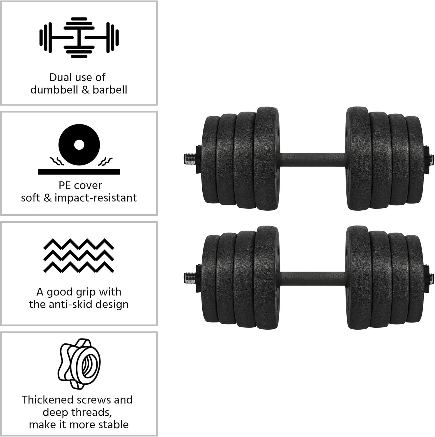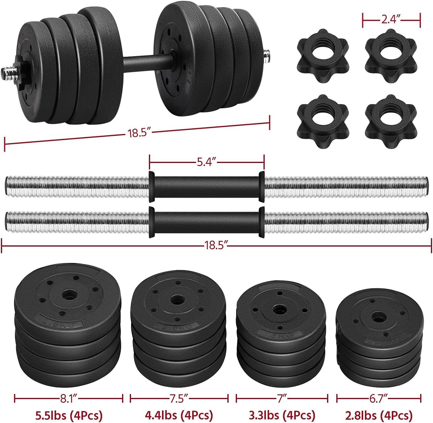 Adjustable weight: Customize it to your ideal exercise intensity! Our dumbbells have 16 weight plates in 4 different weights, 4 pieces for each weight, and 2 spinlock collars make the adjustment easier