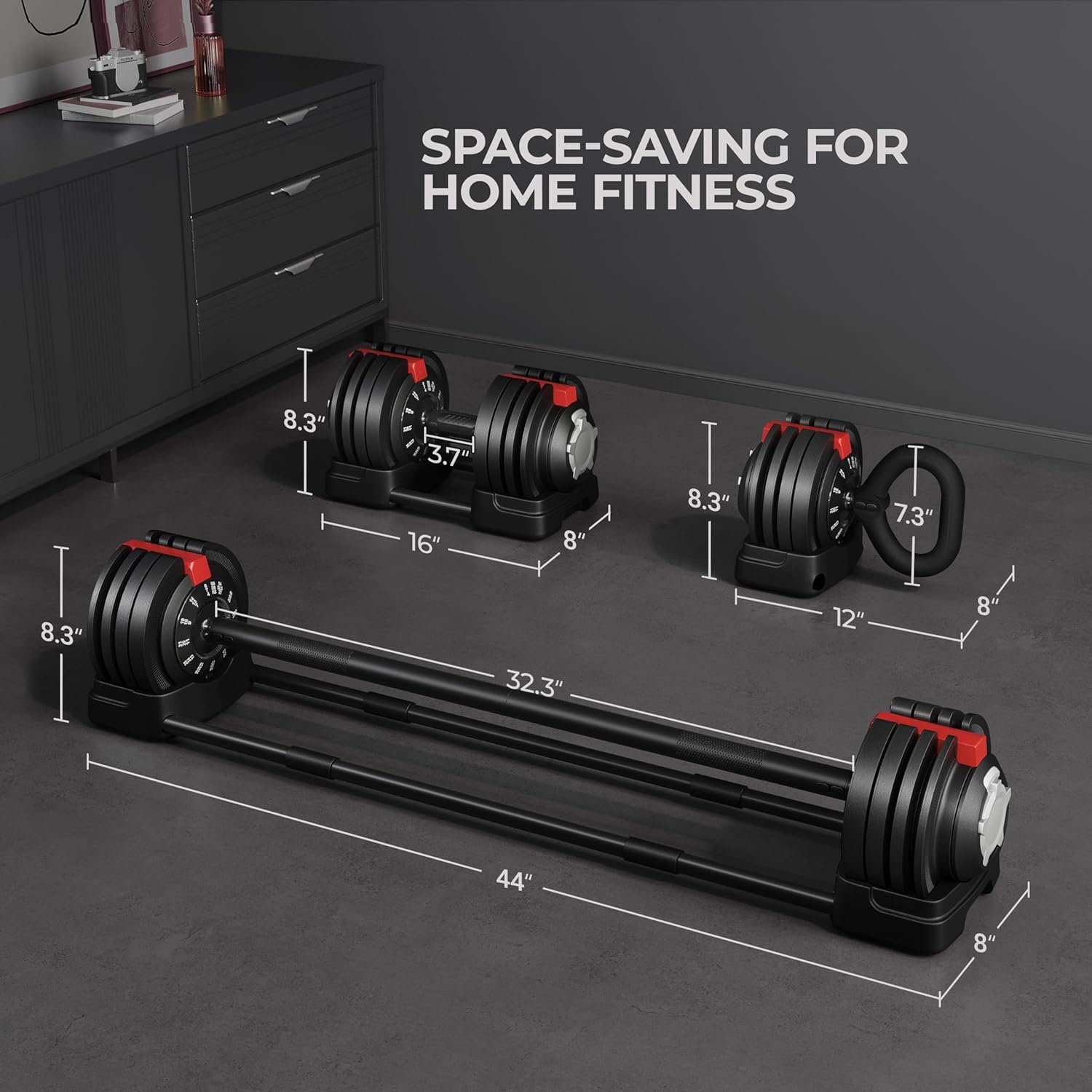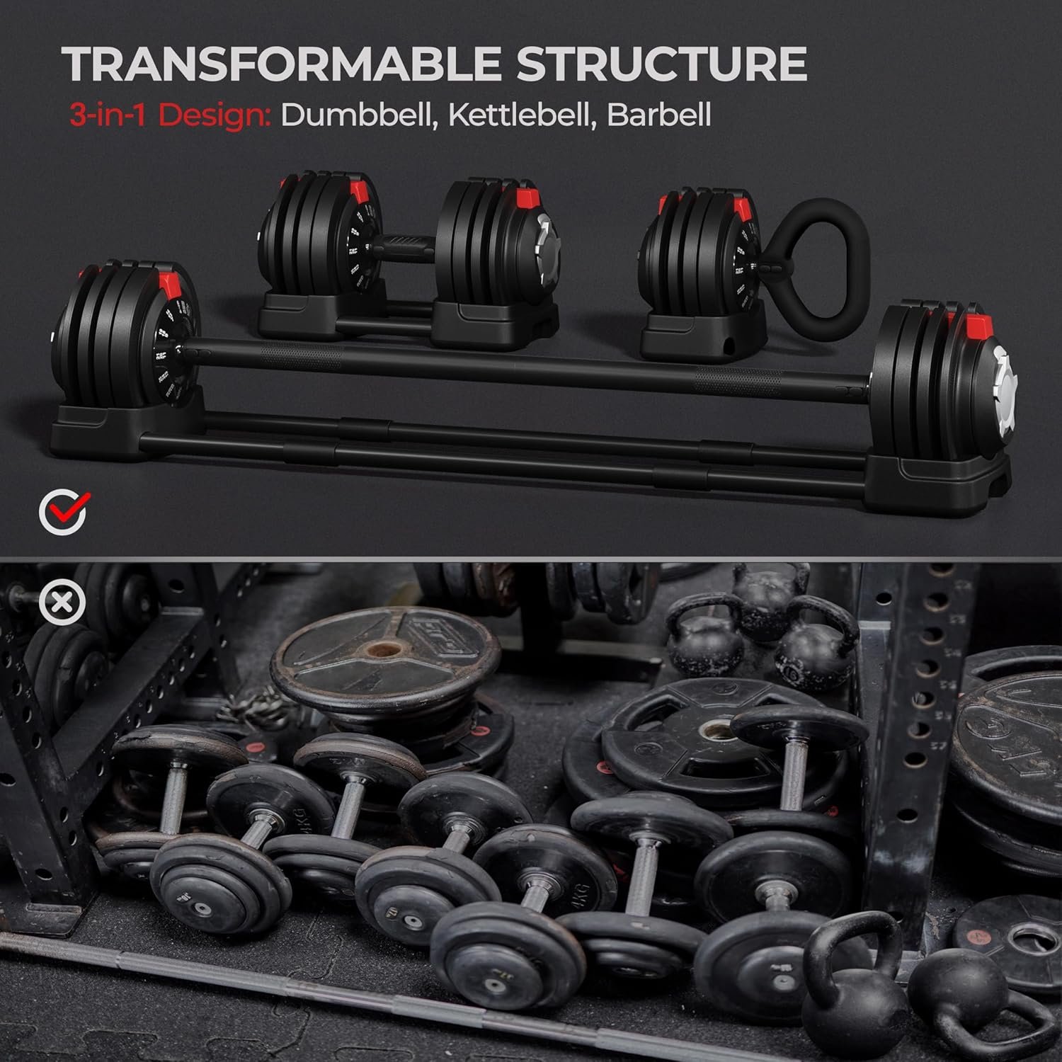 Dumbbell, Kettlebell, Barbell: This workout equipment smartly combines dumbbell, kettlebell, and barbell into 1 versatile free weight set. Offering 12 weight variations in each mode, ranging from 7 lb to 52.5 lb for the dumbbell, 8 lb to 54 lb for the barbell, and 4 lb to 27 lb for the kettlebell, it opens up a vast array of possibilities for free weight exercises