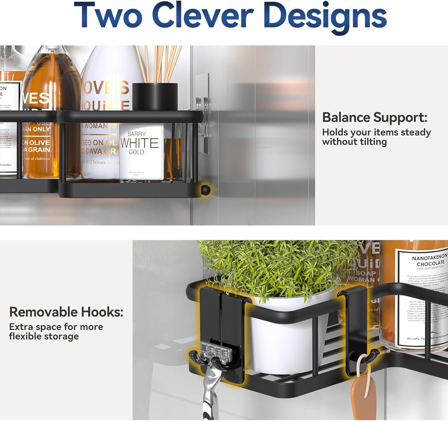 【Upgraded Adhesives and Frame for 40 LBS】Thanks to our upgraded traceless shower shelf adhesives and thickened frame, the adhesive shower caddy is sturdy enough to hold up to 40 lbs (equal to 19 bottles of 34 oz shampoo / shower gel), no worries about falling off