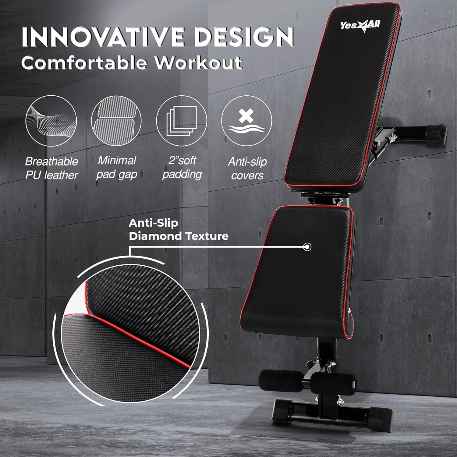 ANTI-SLIP DIAMOND TEXTURE: Innovative diamond textures on this work out bench for home provide a secure grip; Breathable PU leather lifting bench for a comfortable workout; The reusable EPE foam folding workout bench offers