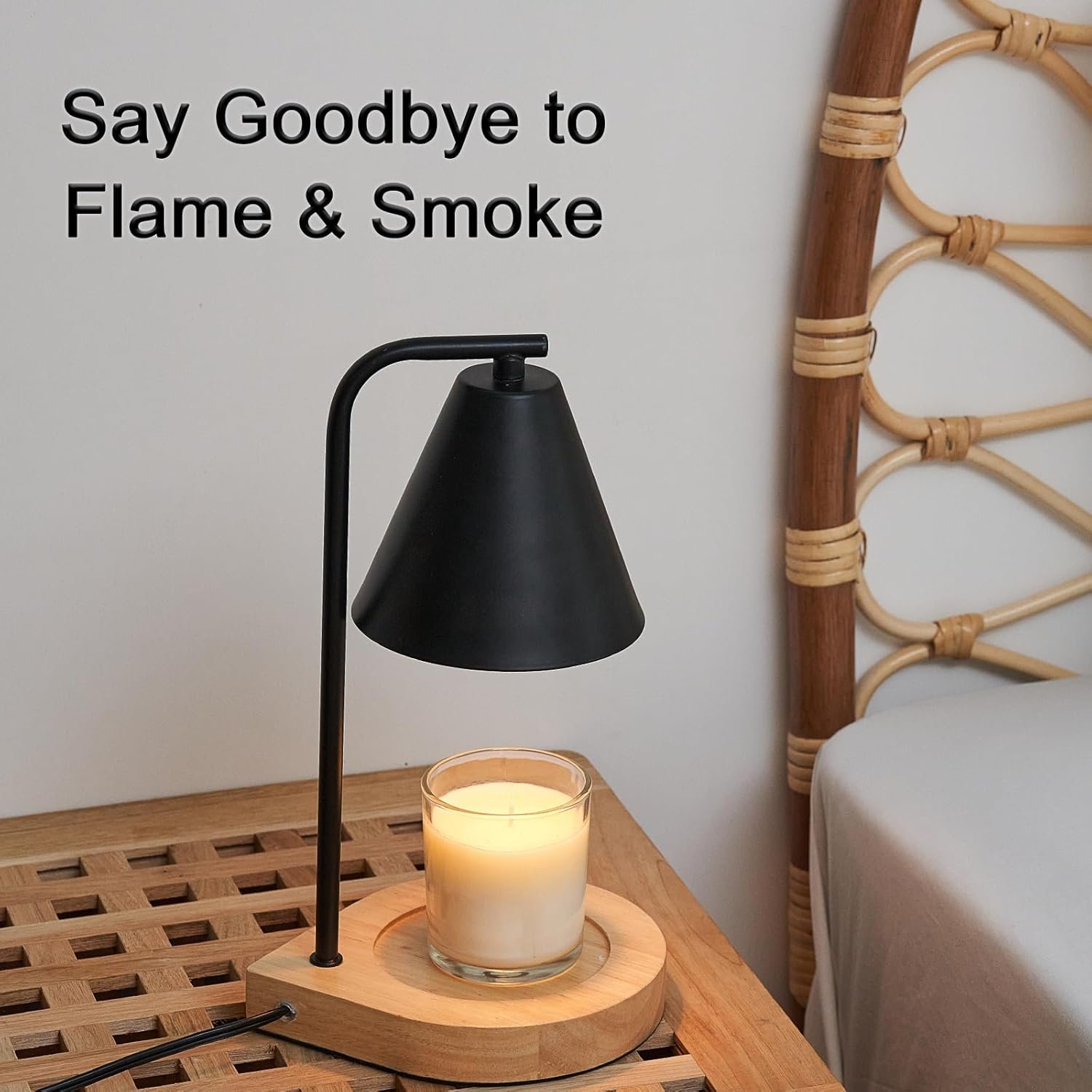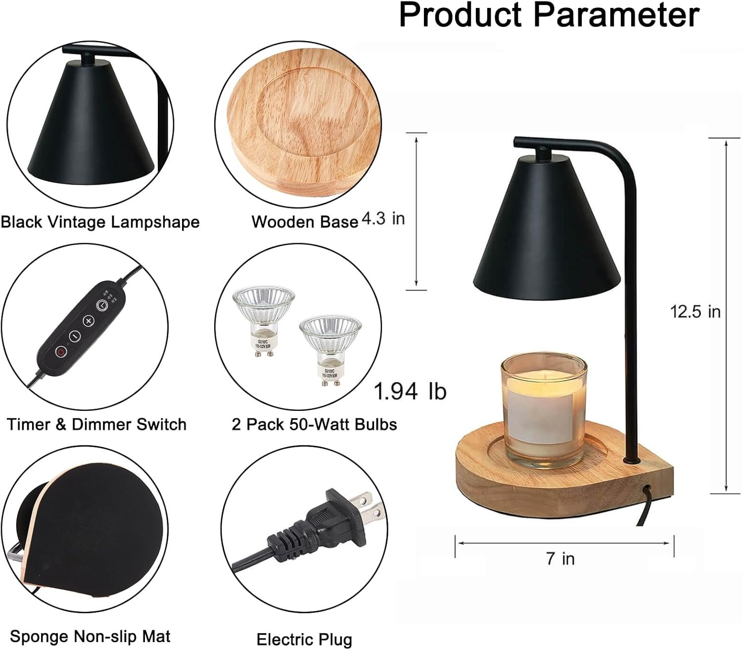 Black Metal Lamp+Wooden Base: The candle warmer lamp with timer is made of black metal shade + wood base+ 50 Watt 2 bulb, connected to the power supply through the plugin.