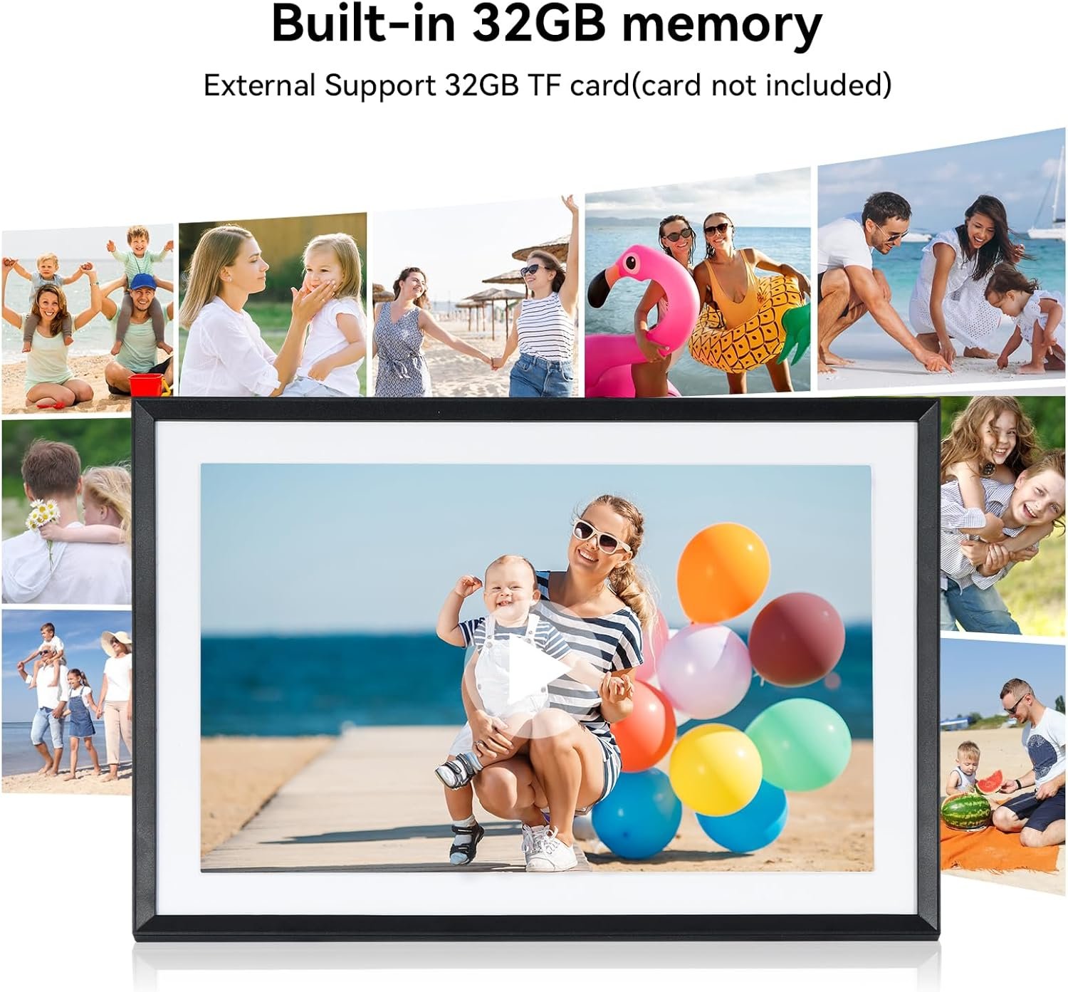 【32GB Built-in Memory】 This digital picture frames load from phone has 32GB of built-in memory and supports Mirco SD cards up to 32GB (not included), allowing you to insert the SD card directly or import videos from the SD card into the electronic picture frame for playback.