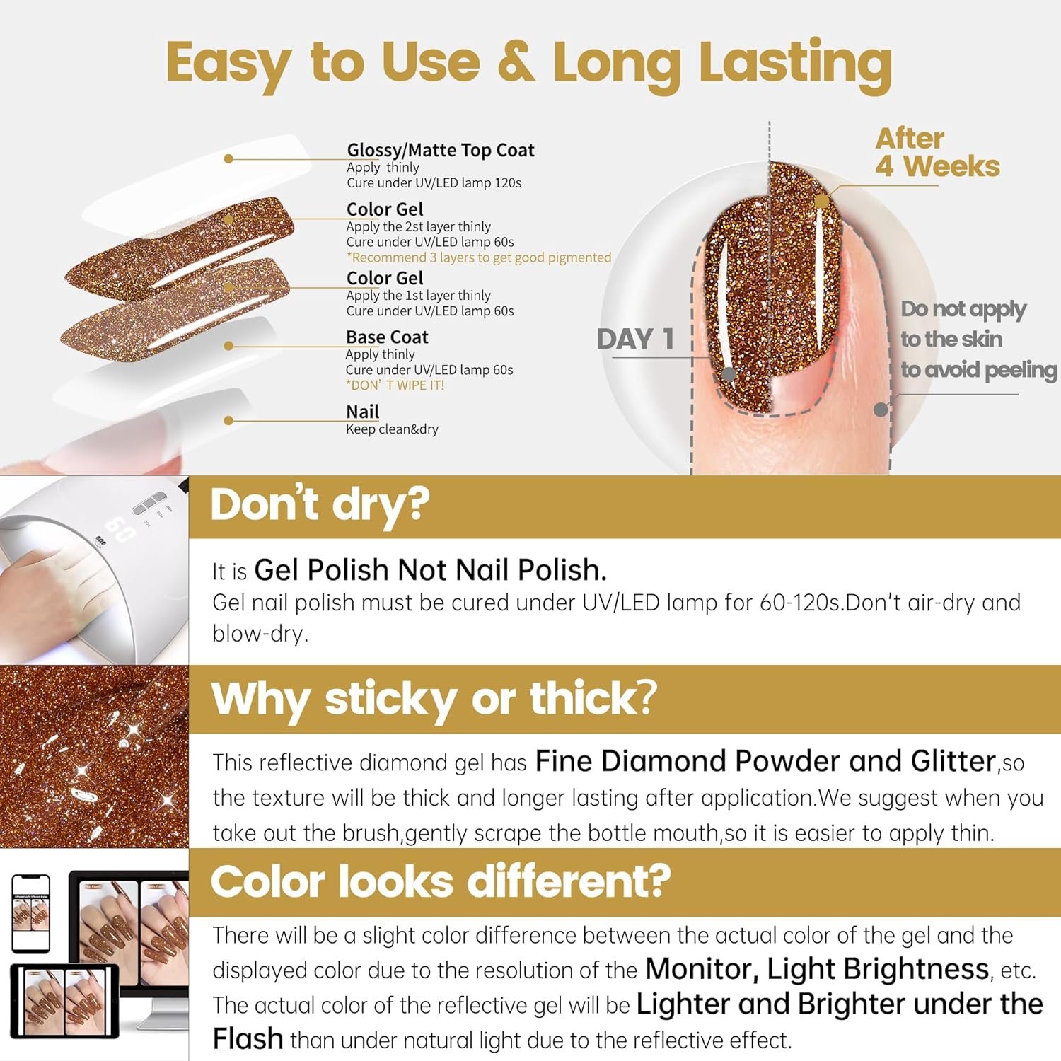 Curing with LED Nail Lamp: Gel nail polish must be cured under LED lamps, and needs to be used in conjunction with gel polish base coat and top coat in order to be more durable, each step of the curing time is 60-120 seconds