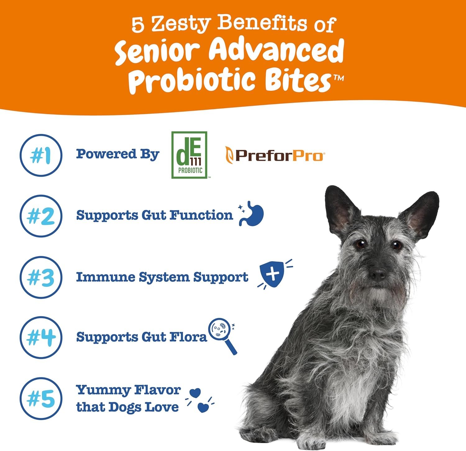 Premium Digestive Support – Zesty Paws Advanced Probiotic Bites feature Prebiotics, Probiotics, and Digestive Enzymes to aid digestion, immune function, and gut flora for dogs with tummy troubles.