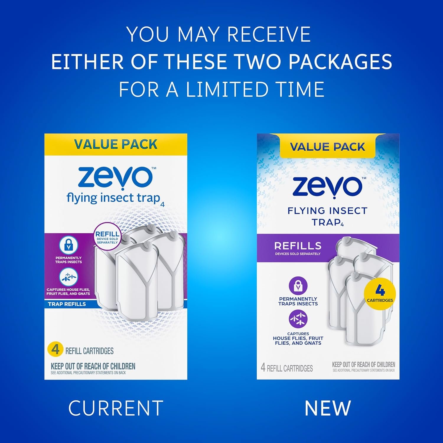The Zevo flying insect refill cartridges captures flying insects onto an adhesive backing that you never have to touch. Simply remove sheet from adhesive backing and insert cartridge into the Zevo fly trap and then plug in. Use in the Zevo Indoor fly trap to attract flying insects (houseflies, fruit flies, and gnats) throughout your home for effortless 24/7 continuous attraction. Great for use in kitchens, bathrooms, garages, and living spaces or near sources of food such as fruit bowls, trash cans, doors, house plants, etc.