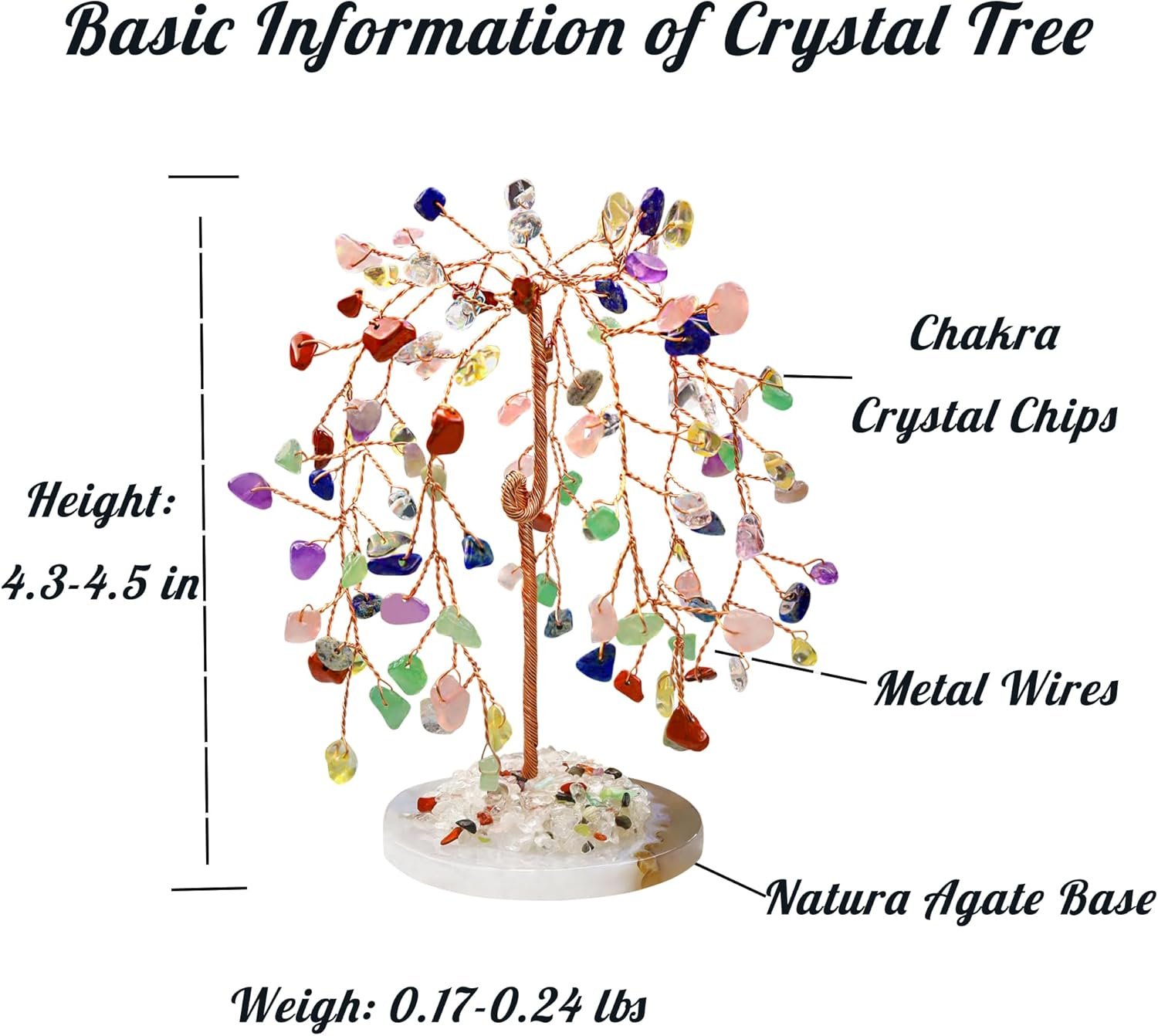 【Crystals Tree】: This is a beautiful Feng Shui natural healing crystals tree. Height of tree : 4.3-4.5 in. Weigh: 0.17-0.24 lbs. And comes with approximately 109 pcs natural crystal chips. This crystal tree is a tree with crystal chips as leaves, metal wires as branches and trunks, and a piece of natural agate as the base.