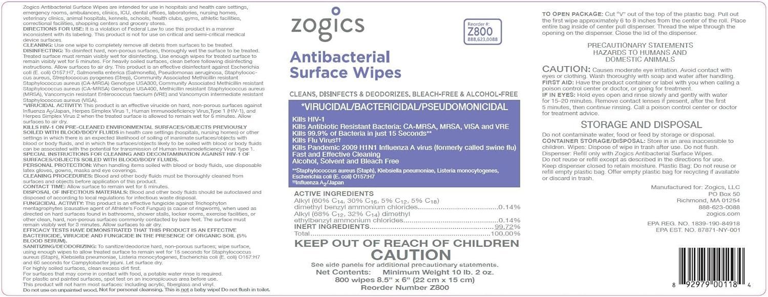 EPA DISINFECTANT WIPES: Zogics EPA-registered disinfecting surface wipes are created with a powerful antibacterial formula to kill 99.9% of germs, of germs, viruses, and bacteria in just 15 seconds, and is effective against H1N1, MRSA, Flu, Strep, Salmonella, HIV-1, E coli, VISA and VRE, and many more.